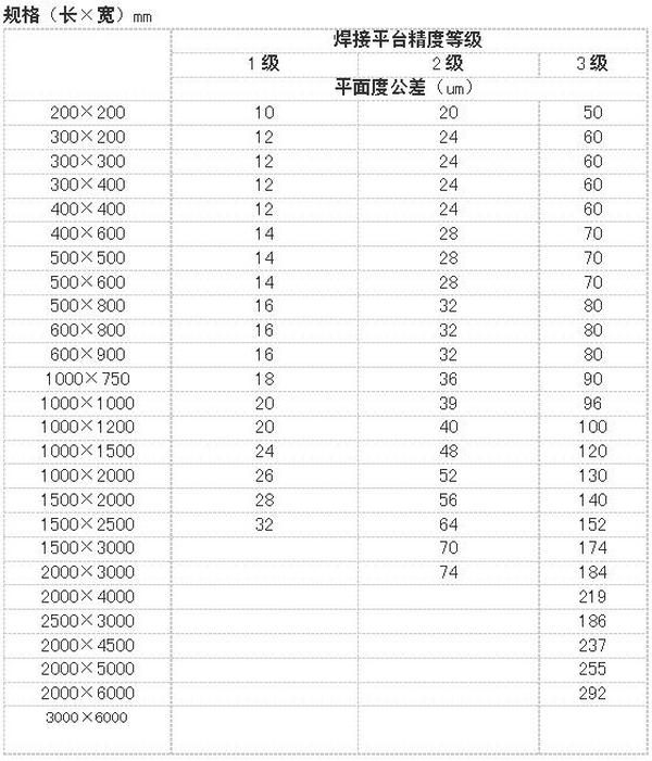 焊接平臺(tái)精度:按國(guó)家標(biāo)準(zhǔn)計(jì)量檢定規(guī)程執(zhí)行,分別為1、2、3四個(gè)等級(jí)。